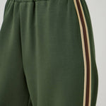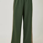 Olive green tracksuit pants with gold stripes and elastic waistband for stylish womens clothes