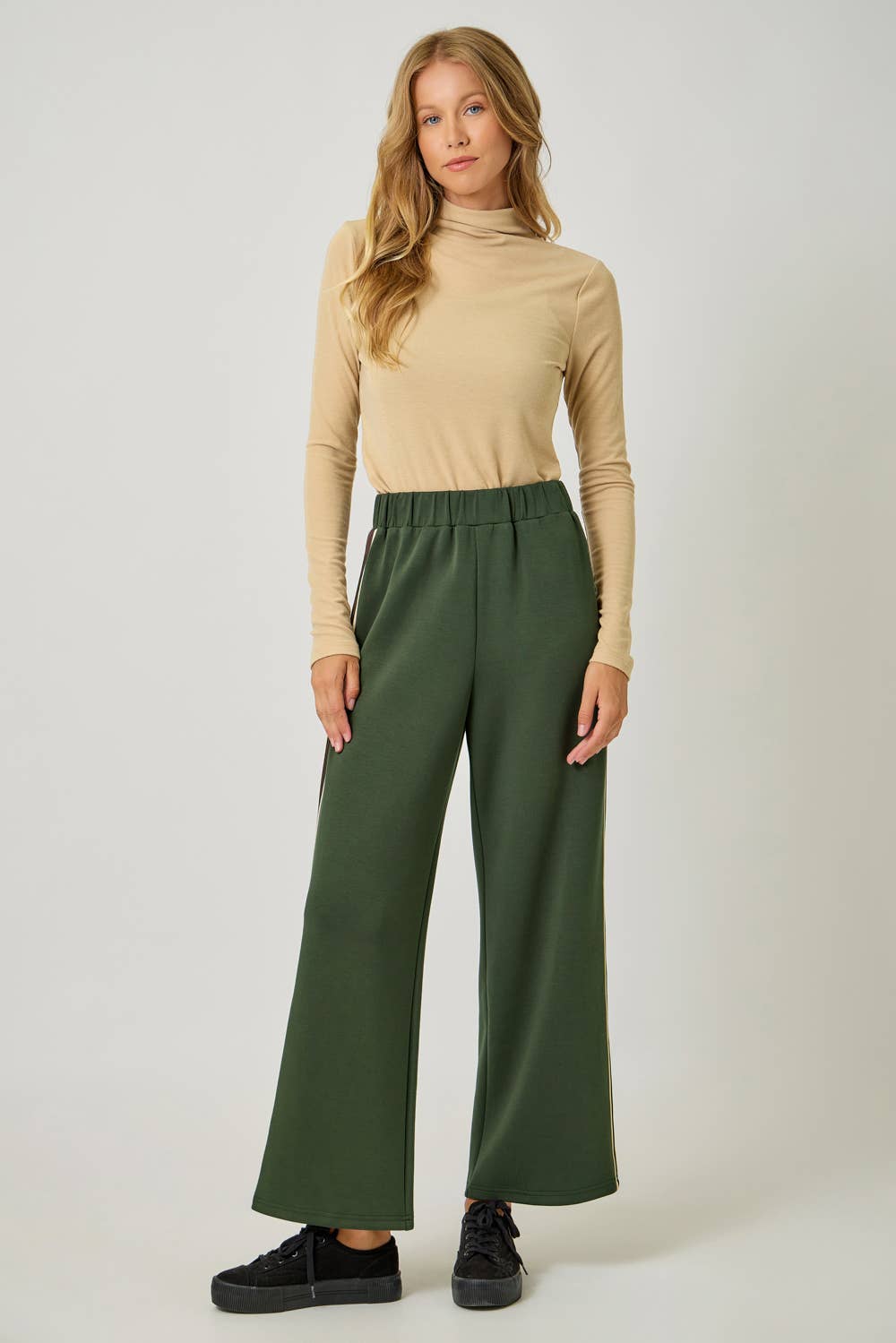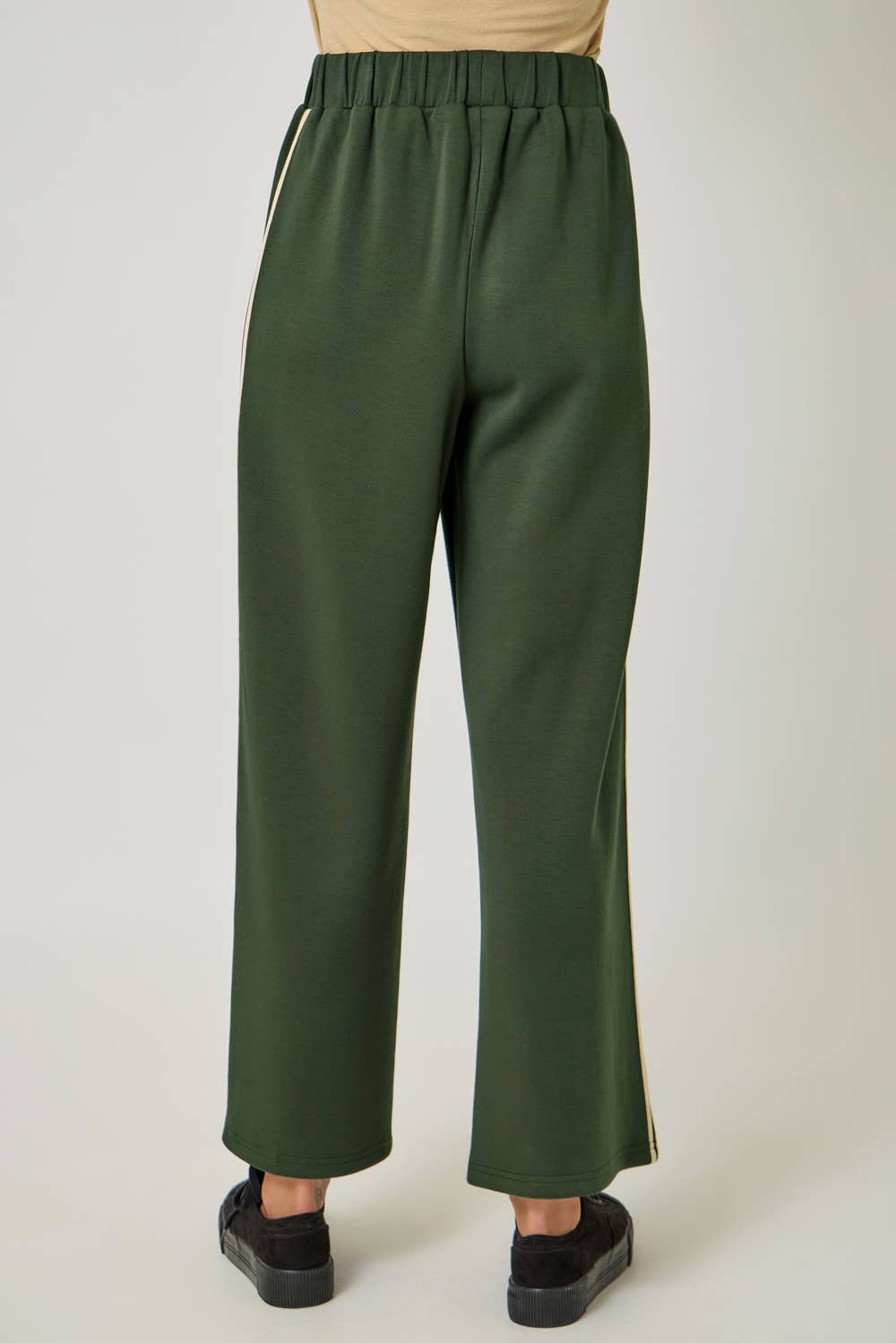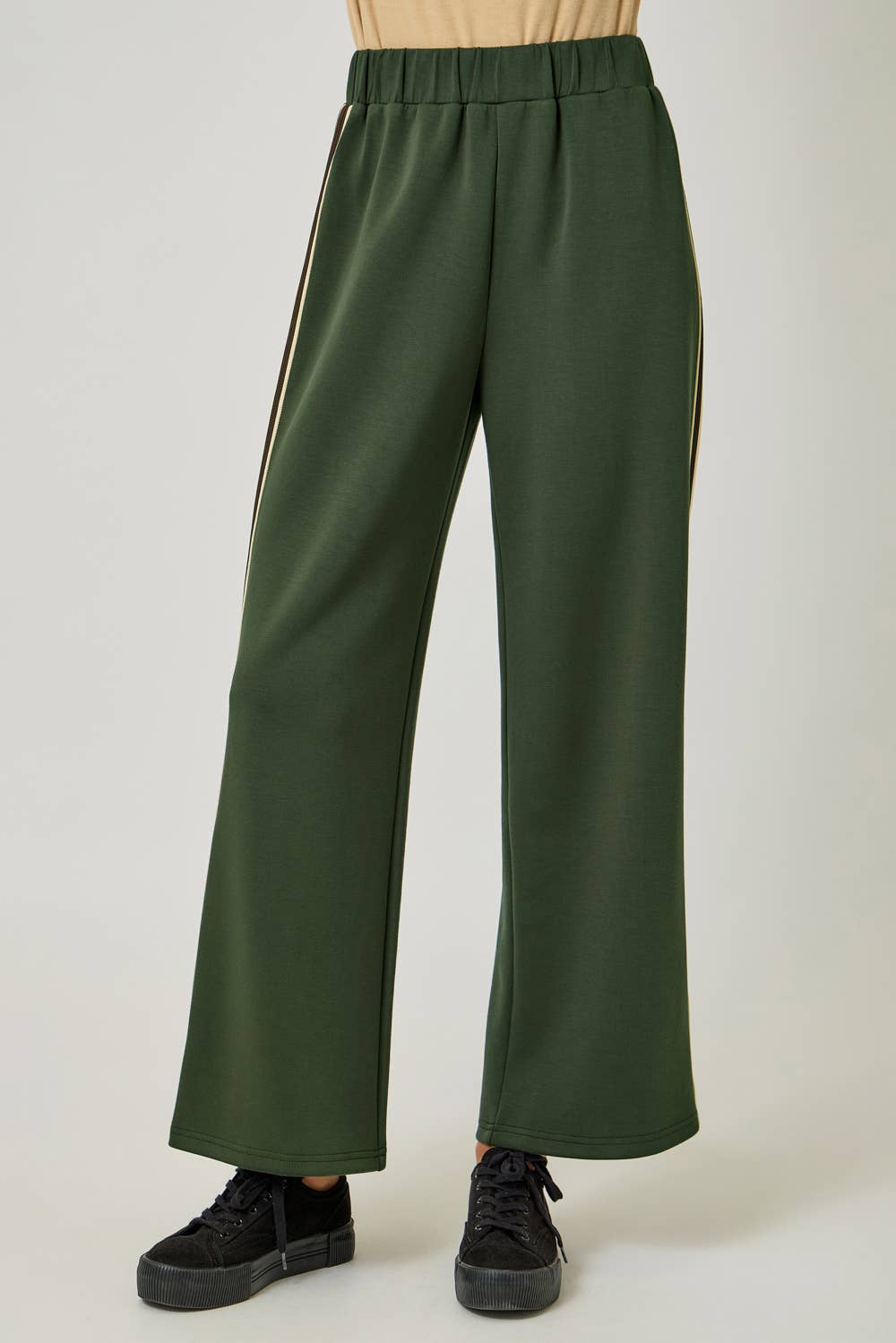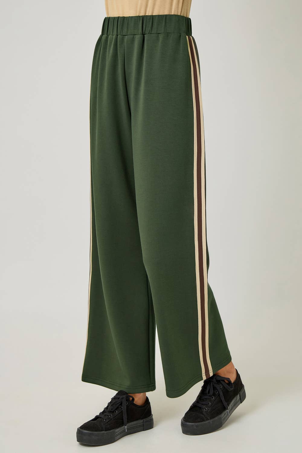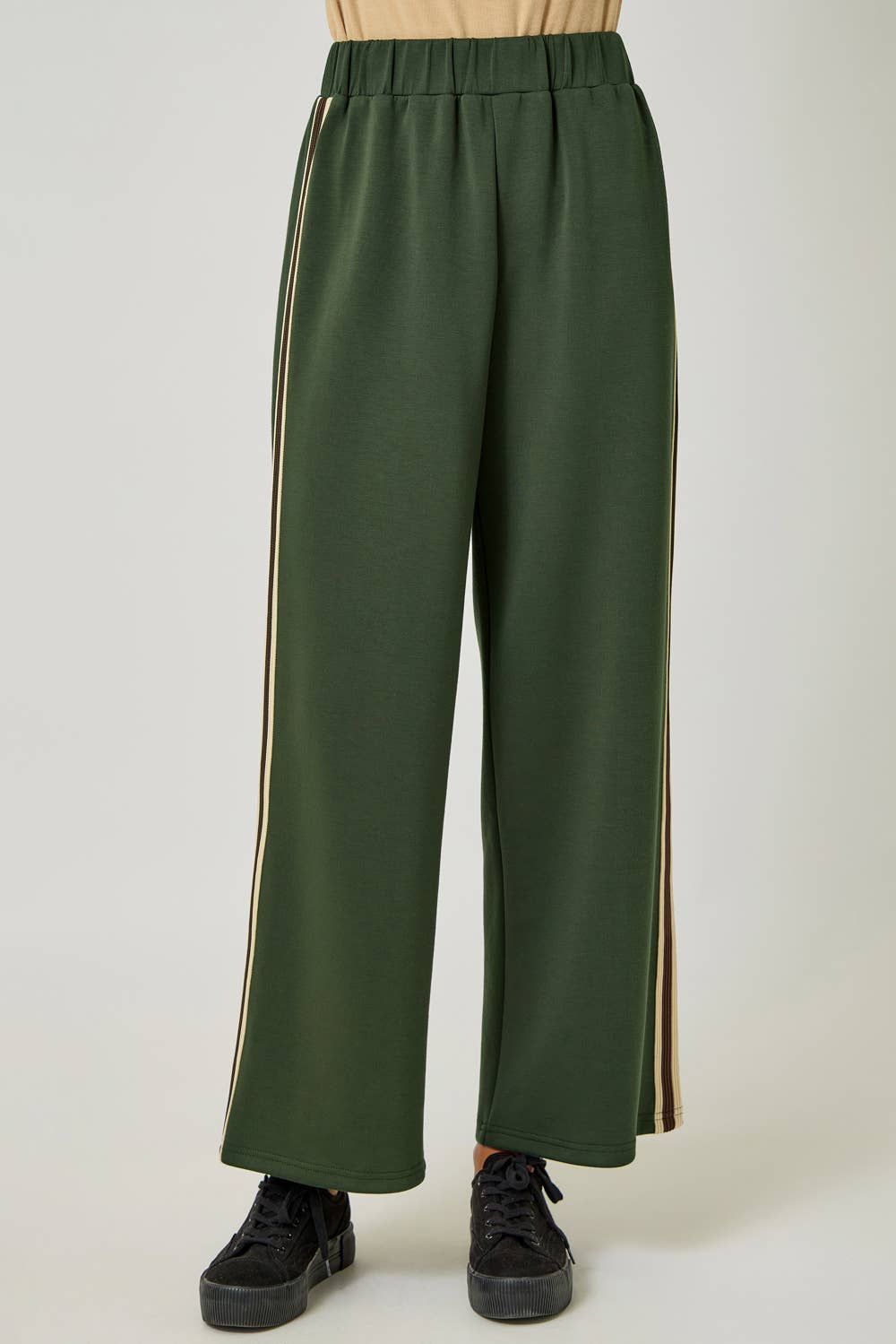 Olive green everyday tracksuit pants with tan wide-leg, elastic waist, and beige side stripe
