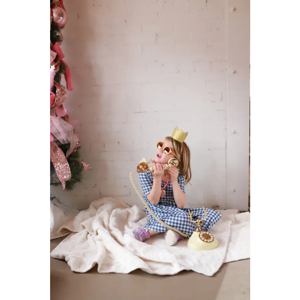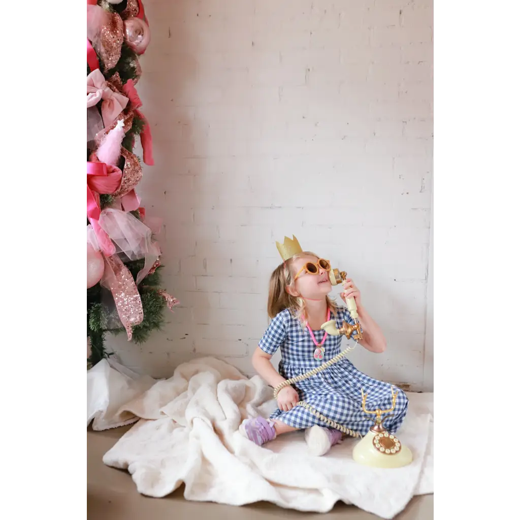 Gingham Bamboo Twirl Dress with crown and telephone