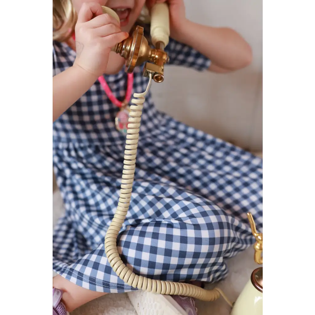 Vintage rotary phone with gold accents on gingham bamboo twirl dress